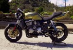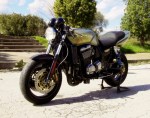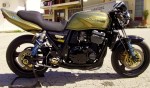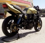 Inspiration came from bike builders like A.C santcuary & Bulldock Japan and i started with a very tight budget of aprox. $800 to build it. A lot of one off parts made by me like the clip on’s, the tail tidy and even the solid brass label on the exhaust is made by hand by me. The color is a unique, one off mixture off gold & green pearl with black stripes on it, and a thick coat of clear laquer (5 hands of it!)