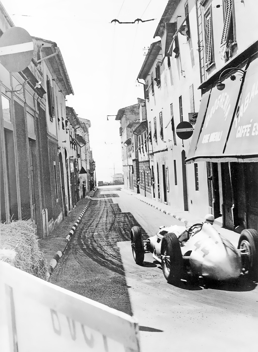 Rudolf Caracciola taking a sharp corner with his Mercedes-Benz W154, in the Coppa Ciano, in and around Livorno, Italy, 1938.