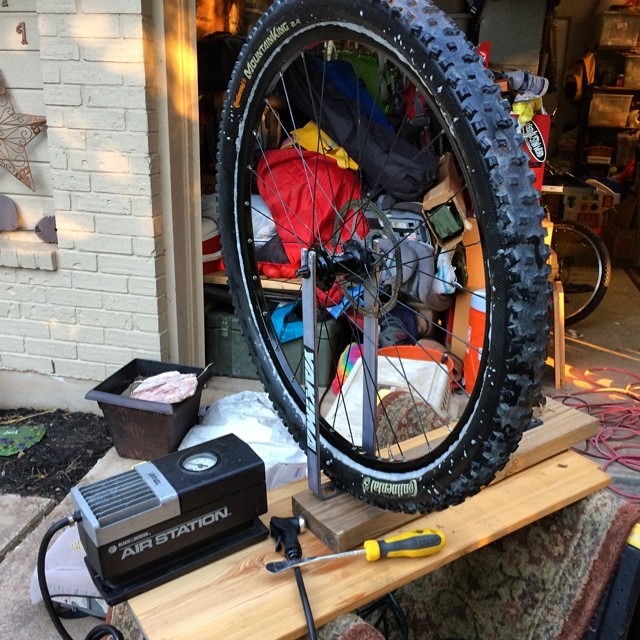 This is really the only way to setup hi volume tubeless. Anything else is a waste of time. Also, you need to have Johnny Cash playing in the background, it encourages the beads to slide on easier. #mtb #atx #johnnycash (at casa de cazadore )