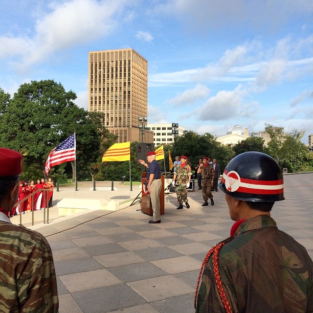 A former “red hat” or American member of the ARVN Airborne Division, salutes the veterans of the Division after speaking a few words during the ceremony. #airborne #paratrooper #vietnameseamericans #vietnam #atx #redhats (at Texas State Capitol)