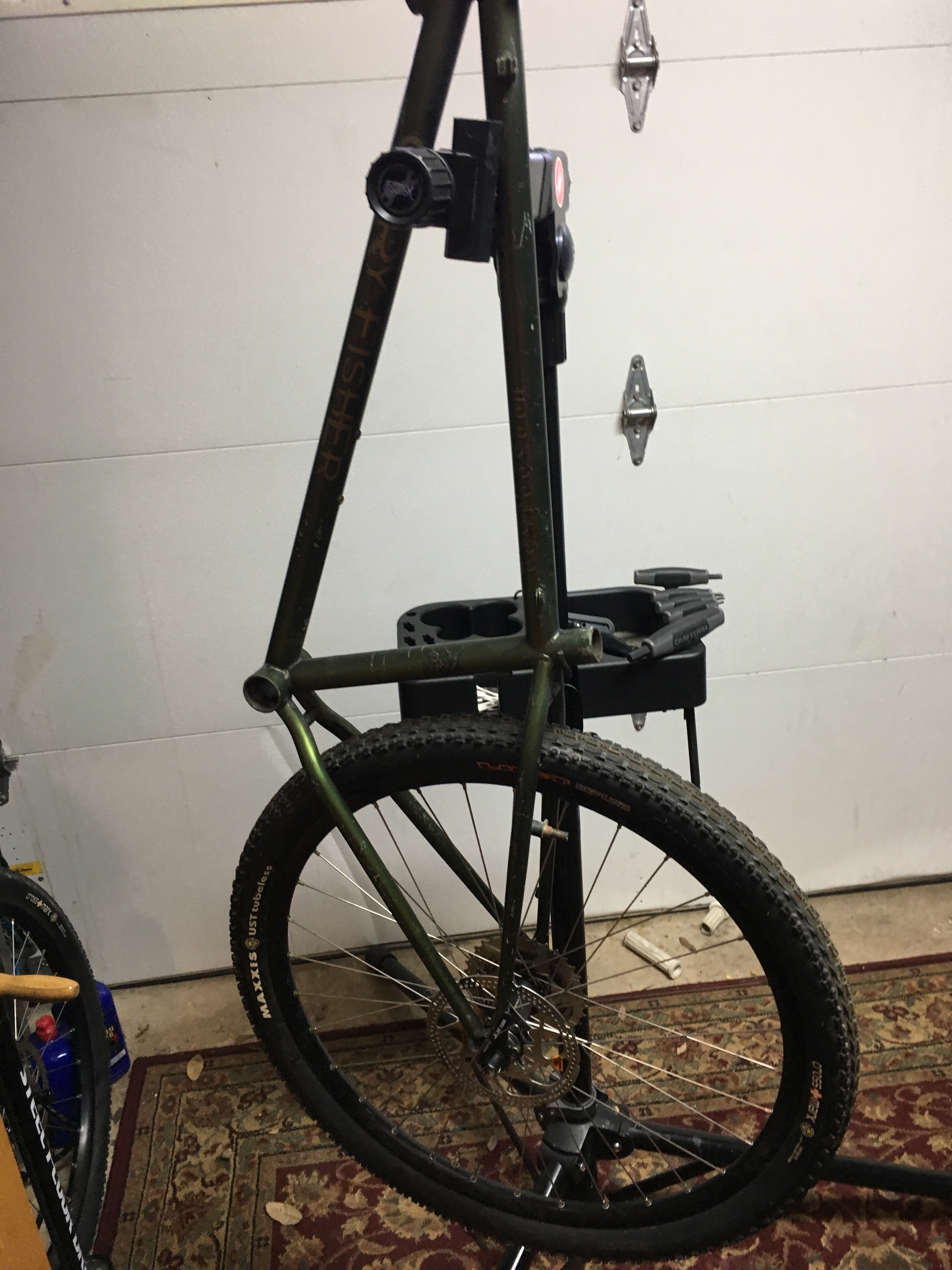 I contacted several frame builders about adding a disk tab to the frame, and got good responses from several. Ultimately I decided to go with Mr Nao Tomii, who builds absolute art out of his shop Tomii Cycles here in Austin. We met and immediately found ourselves on the same wavelength, so I stripped the frame down and dropped it off with him. All he needed was the bare frame and rear wheel in order to assure alignment. While he’s got it, he’s going to strip the finish, and send it to his powder coater for a nice Cyan blue, which was my Son’s choice in color. I’ll report on that once I get it back.